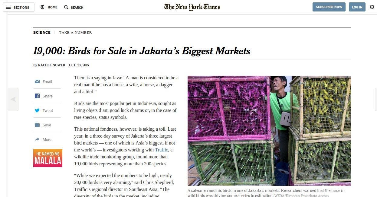 Hasil survei ini juga menarik perhatian koran AS, New York Times. Media terkemuka ini menurunkan artikel bertajuk "19,000: Birds for Sale in Jakarta's Biggest Markets" pada 23 Oktober 2015. (nwk/imk)