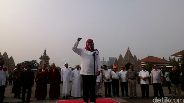 Sebelum melepas ribuan kendaraan motor dan mobil dalam Parade Kebangsaan, Mensos Khofifah juga meminta para pengendara mengirimkan doa bagi mereka yang masih terkena dampak kabut asap.