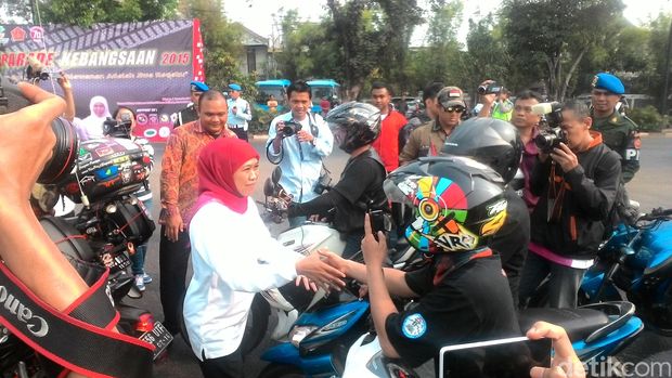 Khofifah yang mengenakan pakaian training putih dengan berjilbab merah itu sempat menyapa para pengendara motor yang mengikuti Parade Kebangsaan. Puncak Hari Kesetiakawanan Nasional dari rangkaian Parade Kebangsaan akan dilaksanakan di Kupang, Nusa Tenggara Timur.