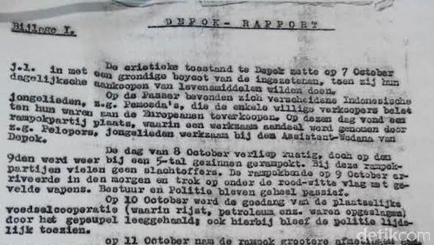 "Pada tanggal 7 Oktober, keadaan di Depok mulai memasuki masa kritis, ketika terjadi sebuah pemboikotan terhadap pasar di wilayah Depok yang biasanya menjadi pusat kegiatan jual-beli."