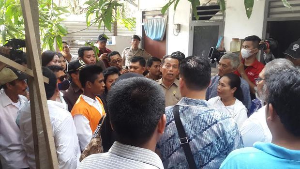 Majelis hakim, jaksa, pengacara dan terdakwa Agustinus Tae menjalani proses sidang di TKP pembunuhan yang berlokasi di Jalan Sedap Malam No 26, Sanur, Bali, Selasa (10/11/2015). Saksi Susiani dan Agustinus memberikan keterangan kepada majelis hakim yang dipimpin Edward Haris Sinaga.