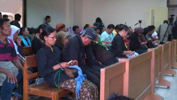 Saat ini sidang sedang berlangsung dan dihadiri banyak orang termasuk sejumlah warga berjarik dan laki-laki memakai blangkon. Sementara itu massa yang melakukan unjuk rasa terus bertambah karena banyak yang menyusul menggunakan truk.