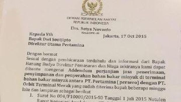 Surat tak bernomor itu beredar di media sosial. Ada kop lambang DPR di bagian atas surat bertanggal 17 Oktober 2015 itu. Di bawah lambang itu tertulis "Drs Setya Novanto Ketua DPR-RI". Surat ditujukan ke Direktur Utama Pertamina Dwi Soetjipto.