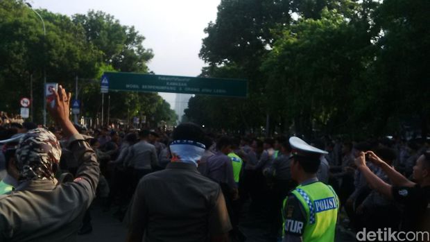 Akibatnya, pengguna kendaraan bermotor sempat terjebak di tengah kerumunan masa. Demonstran juga sempat melakukan aksi dorong-dorongan dengan polisi yang berjaga.