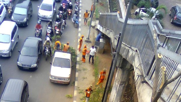 Hingga petang ini pekerja dari Suku Dinas Perindustrian dan Energi Walikota Jakarta Selatan masih berusaha menyalakan semua lampu penerangan JPO.