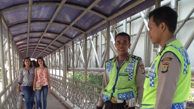 Hari ini, di sejumlah JPO di wilayah Kota Tangerang dilakukan patroli jalan kaki. Sejumlah polisi bersiaga di JPO tersebut.