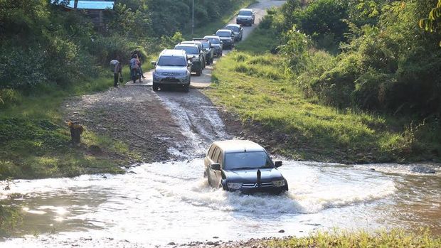 "Karena arus air masih cukup deras mengakibatkan 2 mobil plat nomornya nya terlepas dan hilang di sungai. Bila sungai pasang maka harus menunggu air agak surut 1,5 sampai 2 jam untuk dapat menyeberang," terang dia.