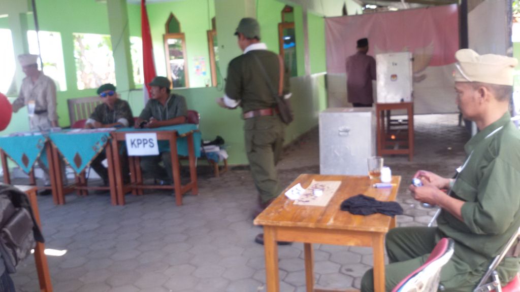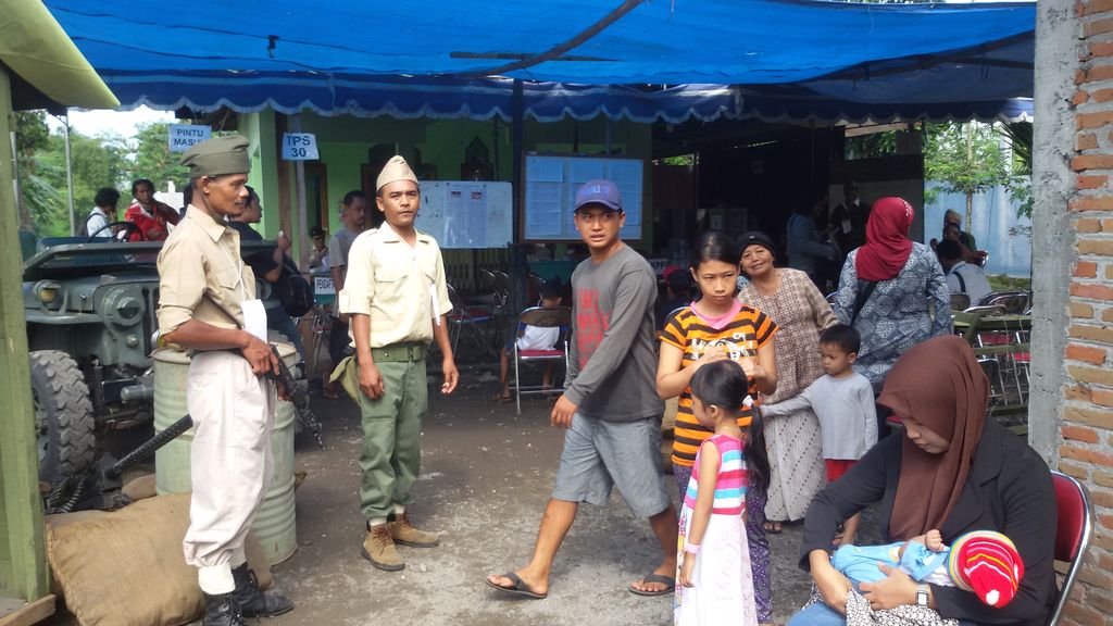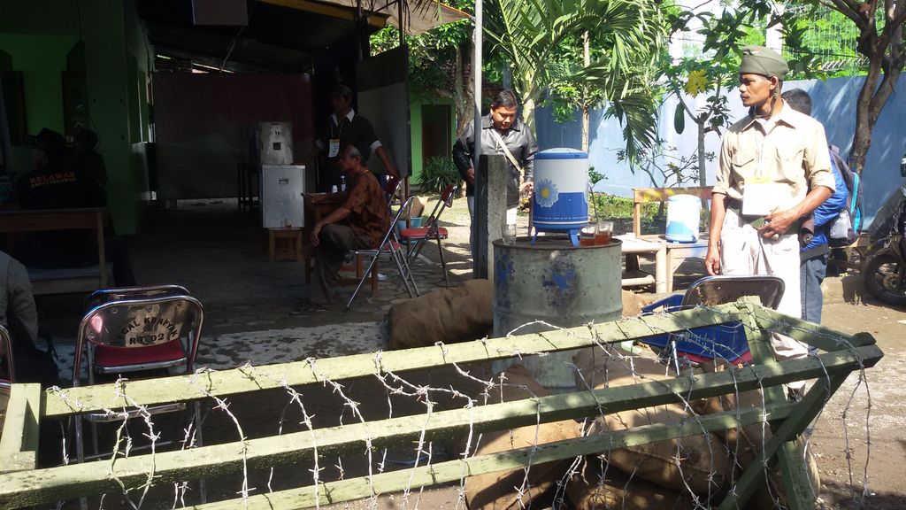 Di lokasi TPS ini dipasang pagar kawat berduri, karung goni untuk persembunyian, sebuah mobil Jeep perjuangan. Petugas KPPS dengan baju pejuang berjaga didepan dengan membawa senjata replika.