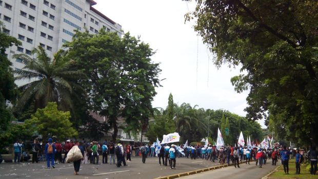 Massa buruh yang berdemo di Jl Medan Merdeka Barat (Foto: Dita/detikcom)