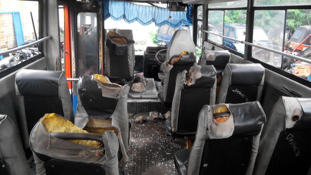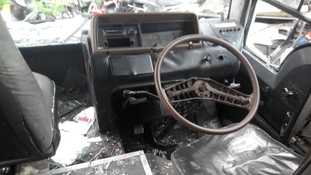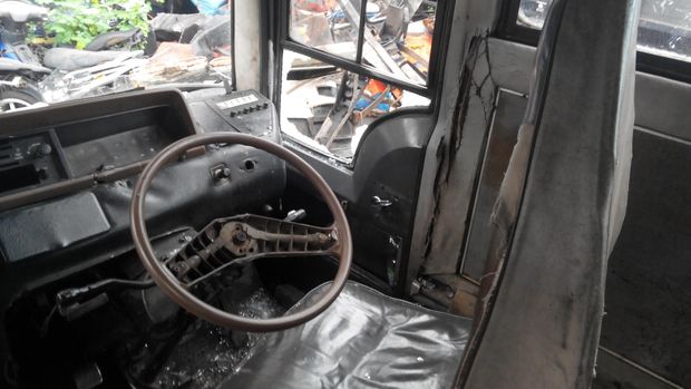 Bus maut itu terlihat berada di Unit Laka Lantas Polres Jakarta Barat, di Jalan Daan Mogot, Jakarta, Rabu (16/12/2015). Saat melihat bagian dalam, terlihat kondisi bus itu sangat bobrok. Di bagian setir, tidak ada tombol klakson.