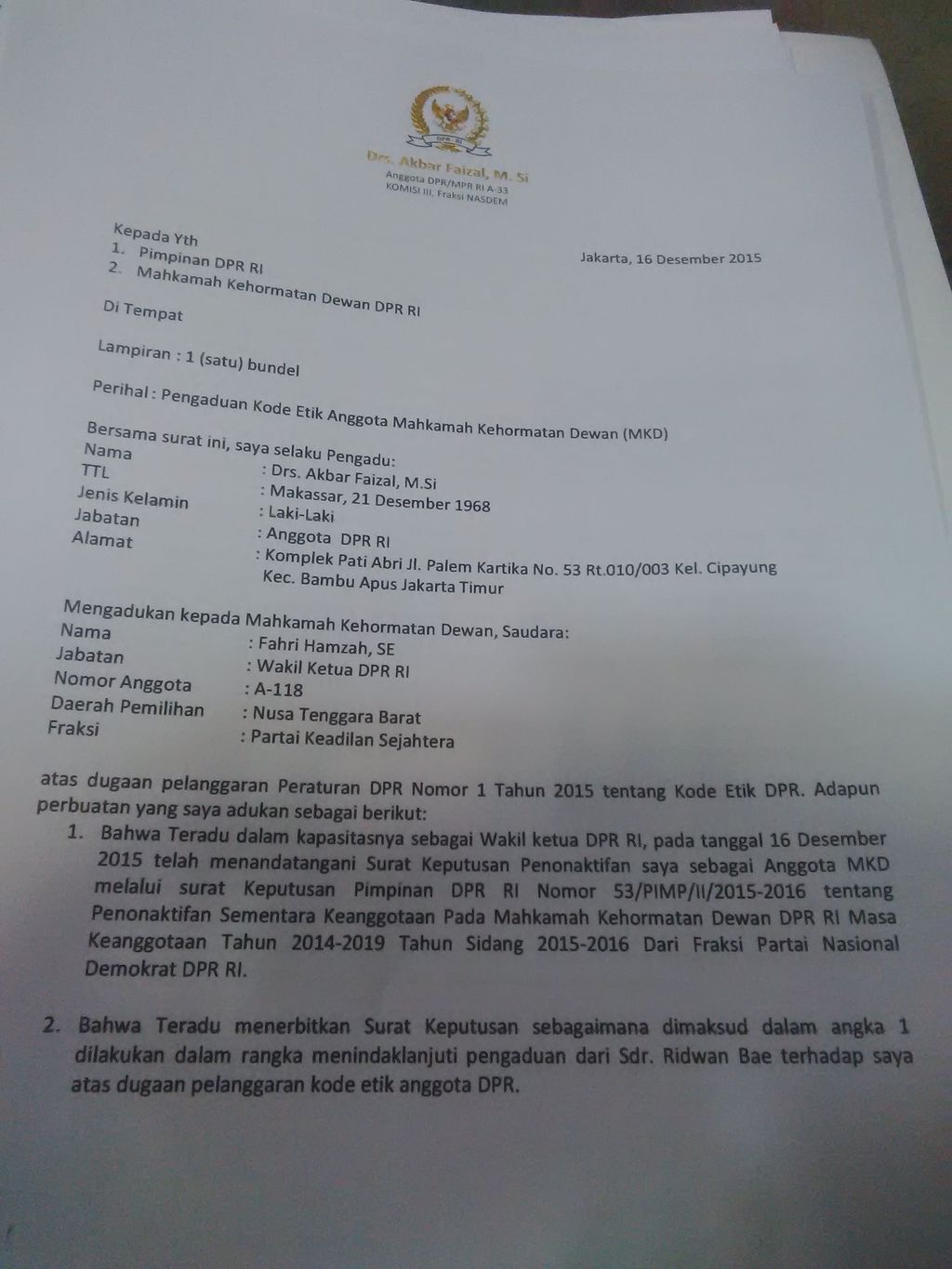 Dalam surat itu disebutkan bahwa Fahri Hamzah dilaporkan diduga melanggar etik karena menandatangani penonaktifan Akbar dari anggota MKD. Penonaktifan itu lantaran ada laporan Ridwan Bae atas Akbar Faizal ke MKD.
