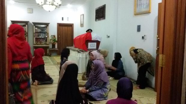 Istri almarhum tampak duduk menunggui peti jenazah yang berbalutkan bendera merah putih. Dia terlihat tak kuasa menahan sedih saat kerabat dan saudara mengucapkan belasungkawa dan memeluknya.