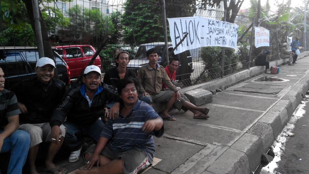 "Dishub kembalikan Metromini yang anda kandangkan, apakah kami disuruh maling", bunyi spanduk di sepanjang pagar trotoar jalan. Ada juga tulisan curhat "Anak dan Istri Kami Menunggu Datang Sesuap Nasi".