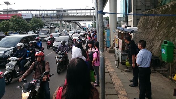 Penumpang menunggu angkutan umum di Jalan Gatot Subroto (Foto: Masaul/detikcom) |