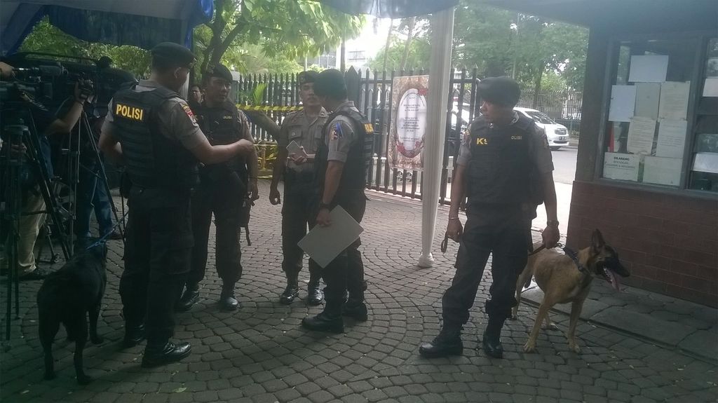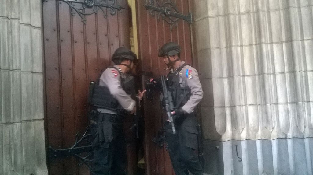 15 Personel Tim Gegana mulai menyisir sekitar pukul 14.25 WIB di Gereja Katedral, Kamis (24/12/2015). Mereka membawa 2 ancing pelacak.
