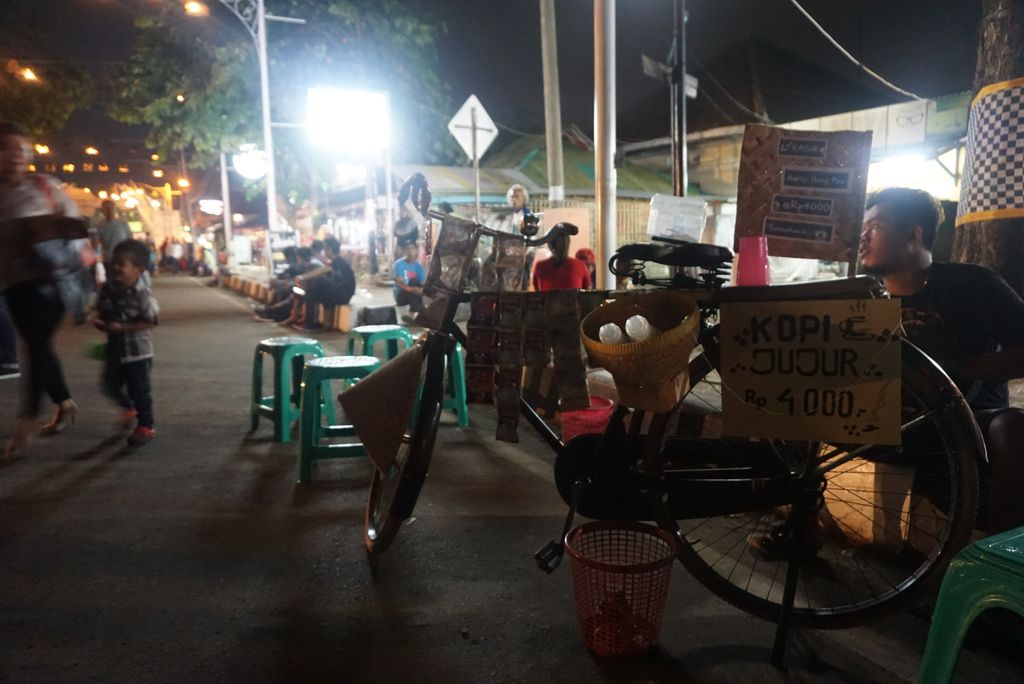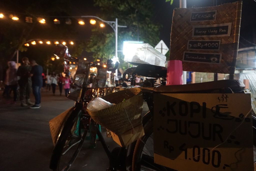 Salah satu yang menarik perhatian adalah dua sepeda ontel yang bertuliskan Kopi Jujur. Sepeda antik tersebut berada di dua titik berbeda, namun keduanya sama-sama menjual kopi instan sachet berbagai merek dan jenis.