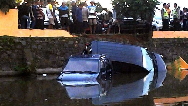 "Mobil dalam keadaan kencang, muncul motor dari pinggir ke tengah menghalangi mobil. Karena posisinya sudah kagok, sopir Avanza langsung banting setir ke kanan dan nabrak mobil Karimun yang sedang parkir. Karena kerasnya benturan Avanza, kedua mobil itu langsung terjun ke kolam setelah sebelumnya menjebol tembok pembatas, sementara pemotor yang ugal-ugalan penyebab kecelakaan itu menghilang," ujar Kevin (23) petugas parkir yang berada di lokasi saat kecelakaan itu terjadi.