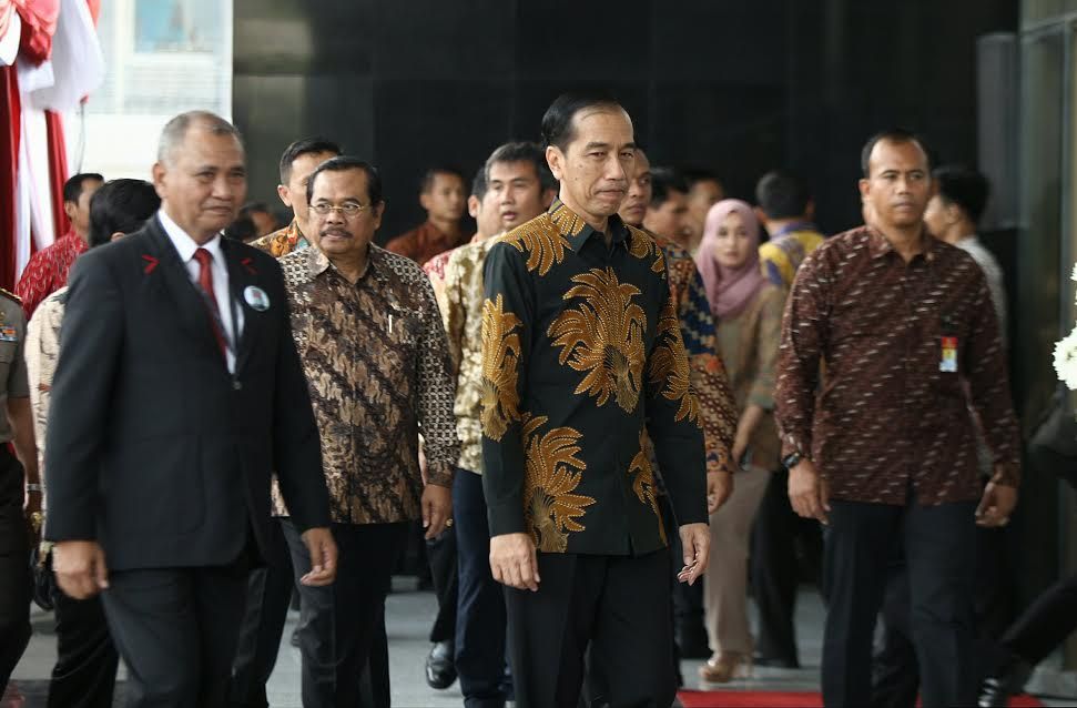 Jokowi, usai meresmikan beranjak menyalami sejumlah tokoh. Saat bertemu Samad, ada momen khusus. Jokowi melempar senyum demikian juga Samad. Sempat berbincang sejenak, Jokowi memegang pundak sebelah kanan Samad.
