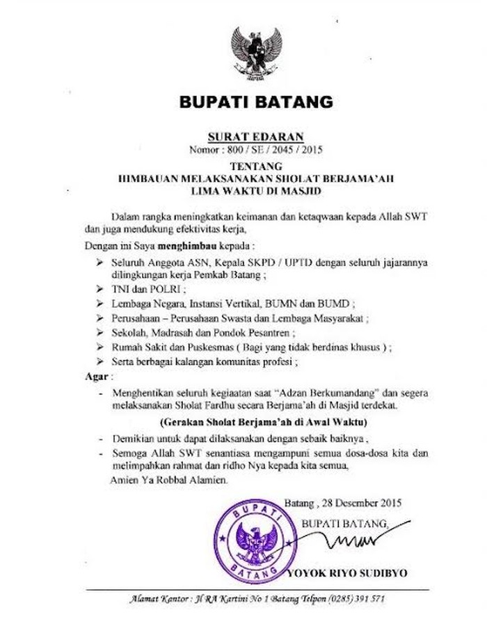 Sejak awal 2015 aturan ini, walau tidak secara tertulis sudah dijalankan. Dan imbas positifnya sangat dirasakan. Masyarakat Batang, yang ingin menemui Bupati atau pejabat daerah tinggal ke masjid raya Batang. Setiap salat fardhu pasti akan mudah ditemui. Dan baru di akhir 2015, dibuat edaran resmi terkait imbauan ini.