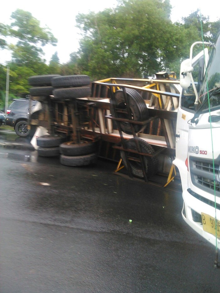 Peristiwa itu terjadi pukul 16.15 WIB, Sabtu (2/1/2016). Truk kontainer B 9065 BEI itu melintang menutup jalur 1, 2, 3 dan 4 menuju Jakarta.