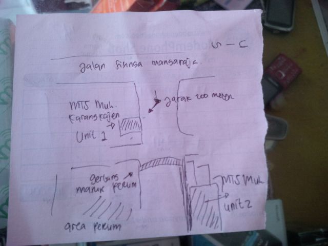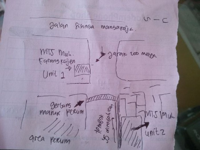 Berdasarkan denah, akses MTs memang cukup sulit. Di sebelah barat dan utara MTs berdiri rumah warga. Jadi, satu-satunya akses ya lewat perumahan.