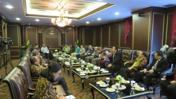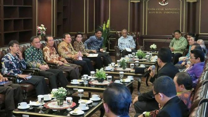 Pertemuan dilakukan secara terbuka di Ruang Delegasi Mahkamah Konstitusi, Jl Medan Merdeka Barat, Jakarta Pusat, Rabu (6/1/2016). Seluruh Hakim Konstitusi dan pimpinan KPK hadir dalam acara ini.