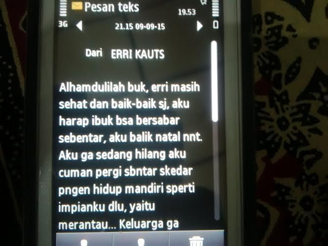 'Alhamdulillah buk, erri masih sehat dan baik baik saja, aku harap ibuk bisa bersabar sebentar, aku balik natal nanti. Aku ga sedang hilang aku cuman pergi sebentar skedar pngen hidup mandiri sperti impianku dlu, yaitu merantau...