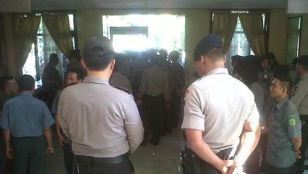 Sebagian massa pendukung yang tidak bisa masuk terus mencoba bernegosiasi ke pihak pengadilan dan polisi agar dapat mengikuti jalannya sidang di dalam ruang Wijayakusuma. Tak henti-hentinya mereka mengucap takbir, aparat kepolisian bersiaga di depan pintu masuk ruang pengadilan, Selasa (12/1/2016).