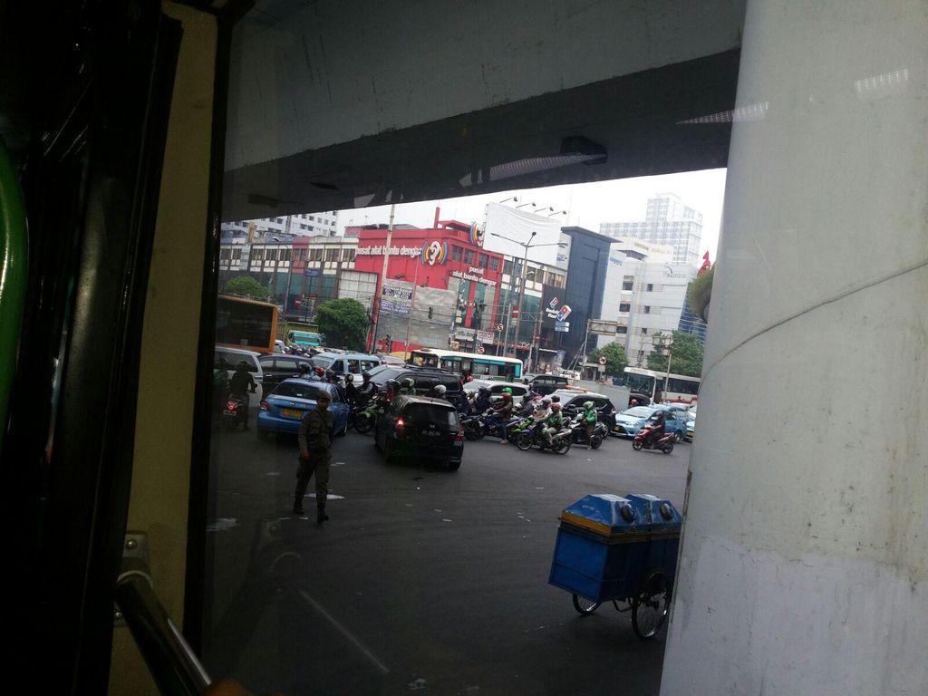 Hingga pukul 09.15 pagi ini hanya tetlihat 3 petugas Satpol PP yang mengatur lalu lintas. Mereka tak dapat berbuat banyak karena banyaknya kendaraan.