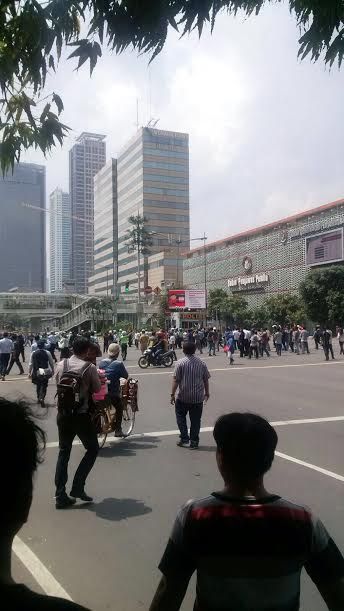 Peristiwa ini terjadi sekitar pukul 10.15 WIB, Kamis (14/1/2016). Polisi mengidentifikasi pelaku sebagai pria bermotor dan bersenjata.