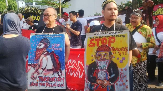 Tak hanya membawa spanduk dukungan, beberapa orang orator yang tergabung dalam Brigade Manguni Indonesia mengenakan pakaian tradisional asal Kalimantan sambil membawa spanduk dukungan agar pariwisata Indonesia tak merosot pasca teror bom.