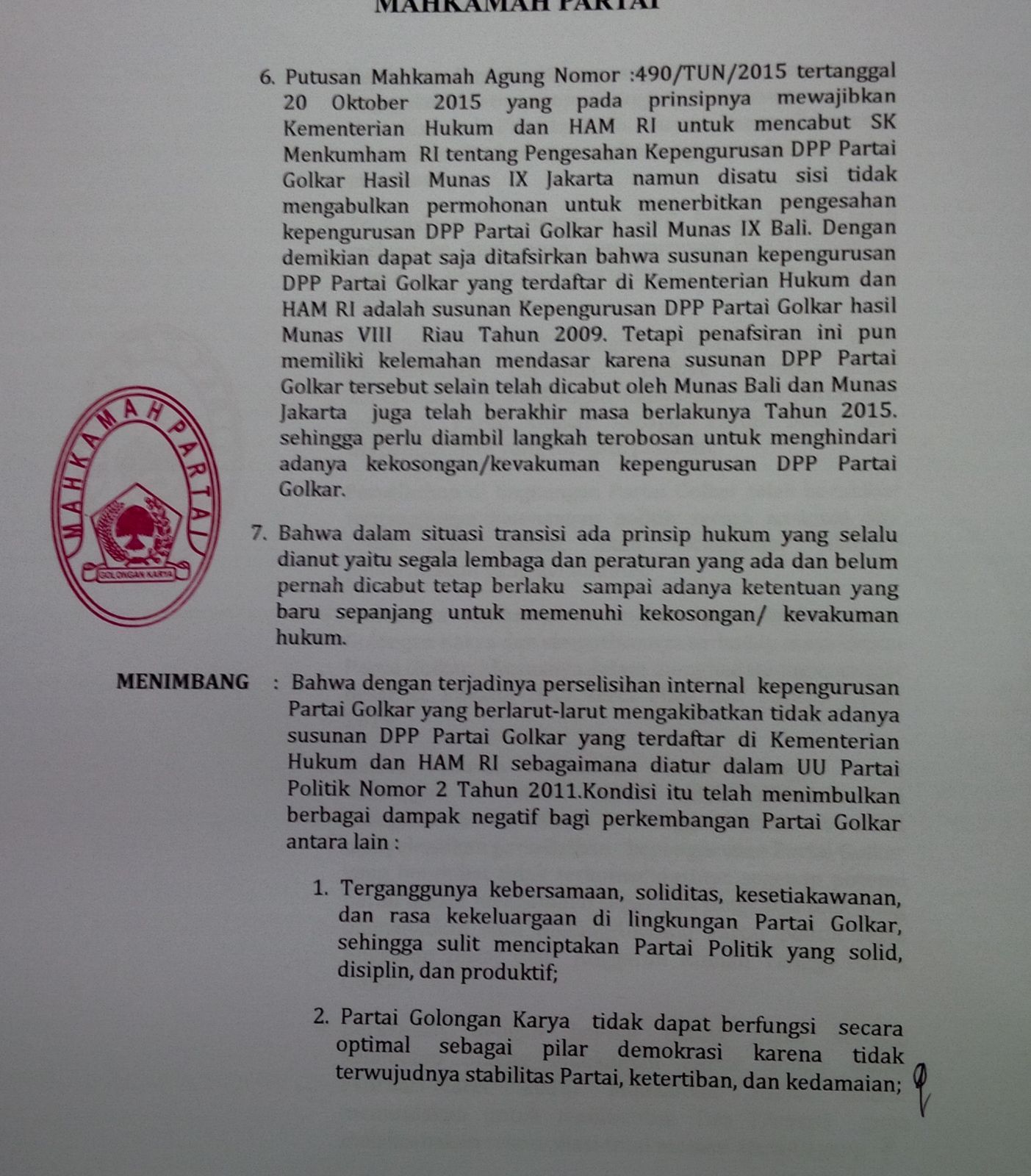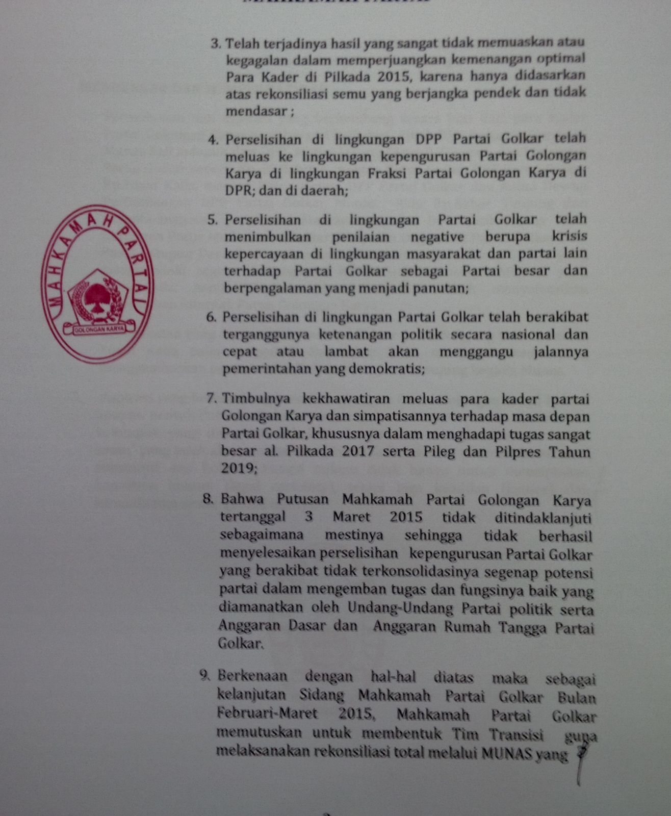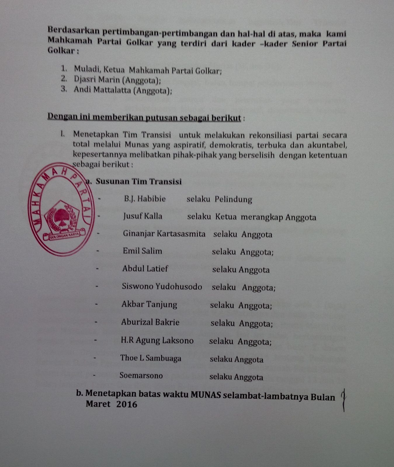 Jakarta - Mahkamah Partai Golkar (MPG) membuat putusan membentuk Tim Transisi untuk menyelesaikan sengketa kepengurusan Golkar. Ini putusan lengkap MPG: