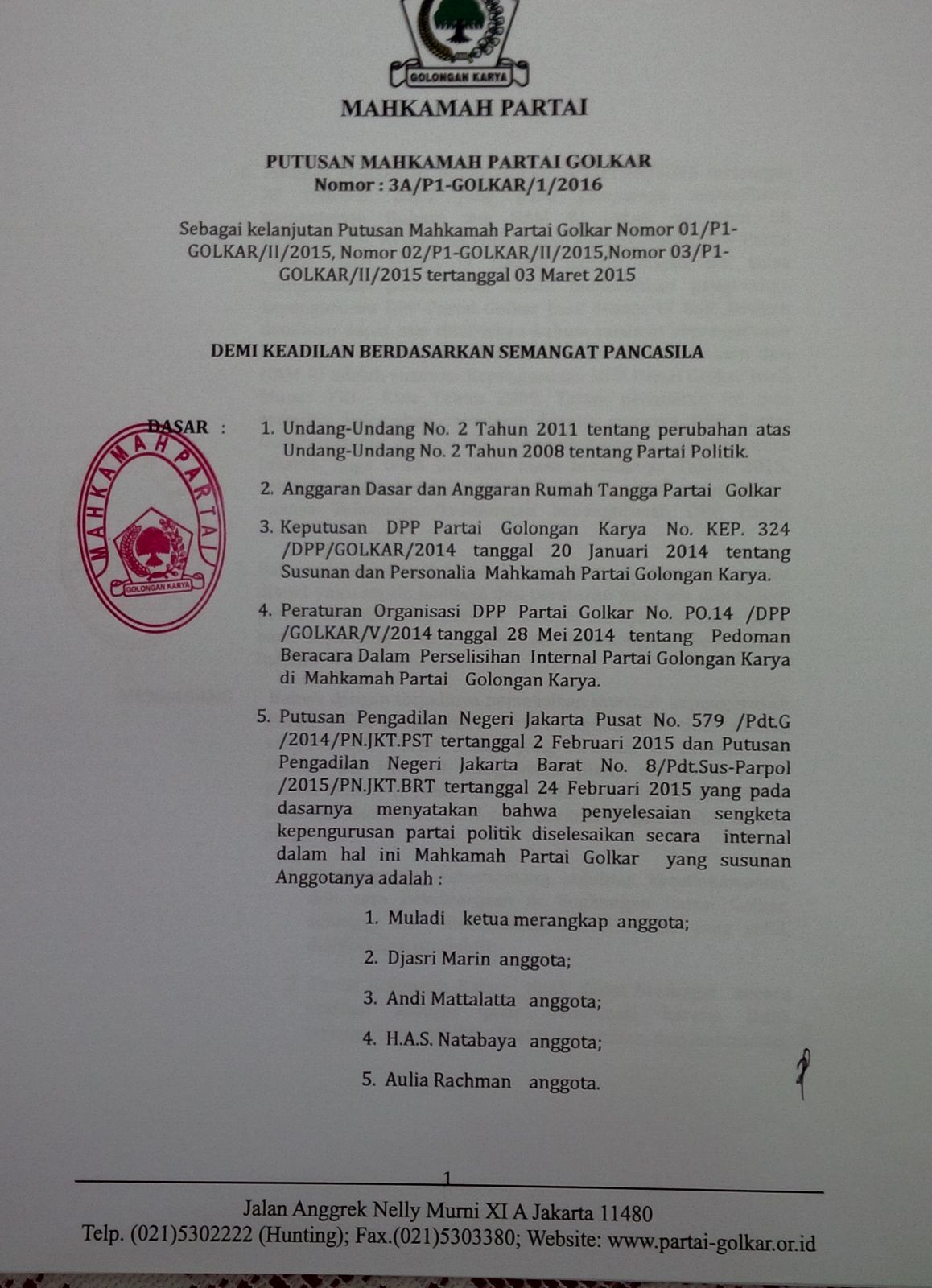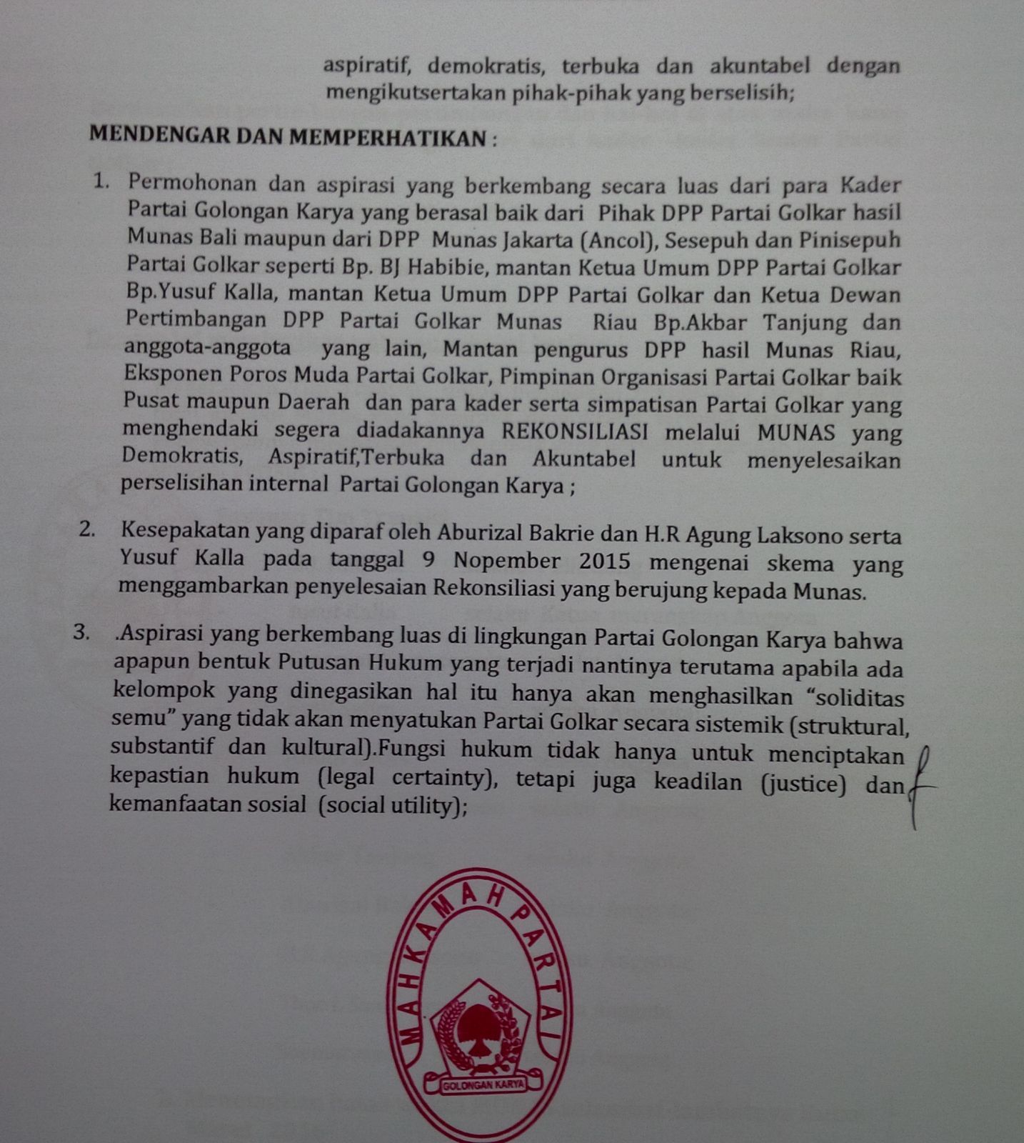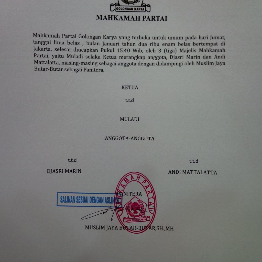 Jakarta - Mahkamah Partai Golkar (MPG) membuat putusan membentuk Tim Transisi untuk menyelesaikan sengketa kepengurusan Golkar. Ini putusan lengkap MPG: