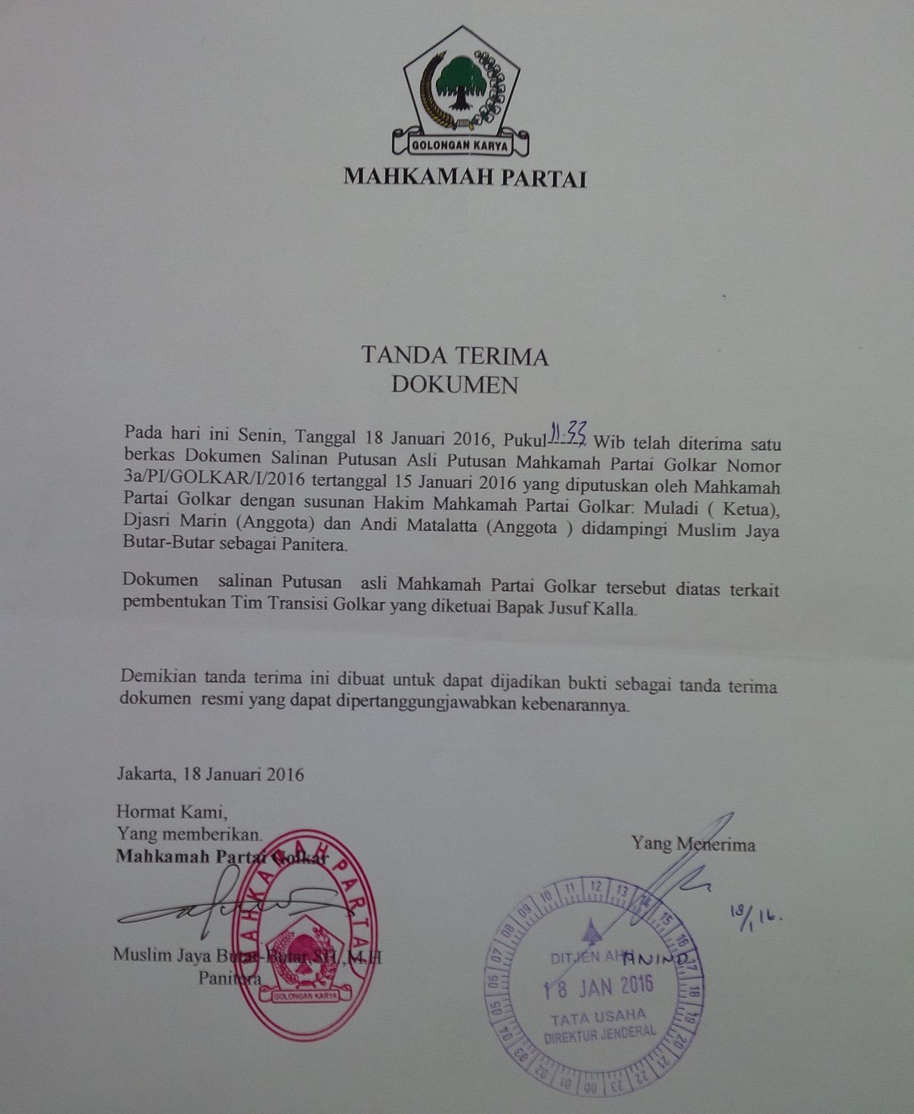 Seorang politikus Golkar yang menunjukkan bukti tanda terima dari Kemenkum HAM dan MA mengatakan tujuan putusan itu diserahkan ke kedua lembaga itu adalah agar Tim Transisi memiliki legalitas.