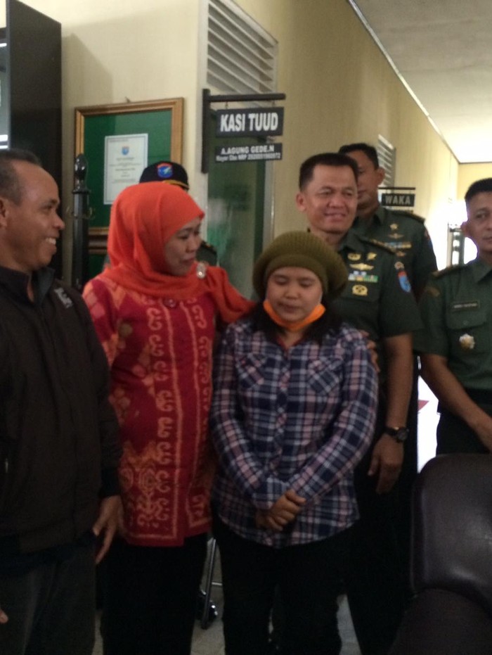 detikcom menyaksikan pemandangan itu di Bekangdam XII/Tanjungpura, Pontianak, Kalimantan Barat, Jumat (22/1/2016). Khofifah terus memeluk anak perempuan yang diketahui bernama Mentari itu sambil sesekali mencium keningnya.