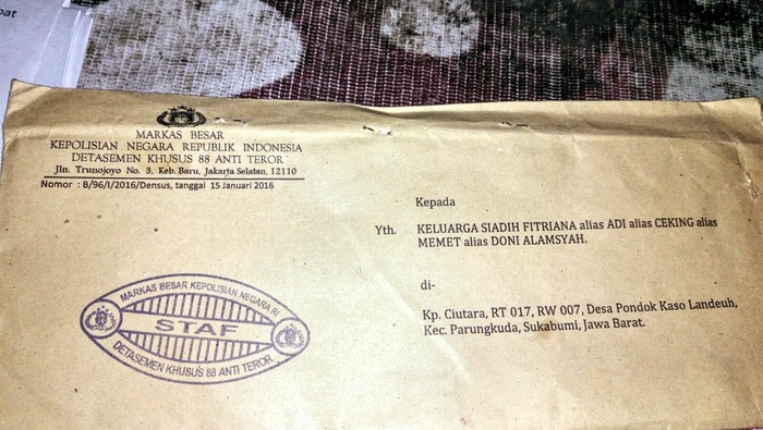 Keluarga Siadih baru menerima surat tersebut pada Jumat (22/1/2016) siang. Mereka mengaku tidak percaya Siadih yang dikenal pendiam dan jarang bergaul tersebut diduga terlibat aksi terorisme.