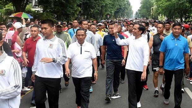 Lewat foto yang dikirimkan Biro Pers Istana, Jokowi terlihat mengenakan baju olahraga lengan panjang warna putih dipadu celana olahraga berwarna hitam. Dia tampak berjalan dan melambaikan tangan kepada warga Solo yang tumpah ruah di jalan.