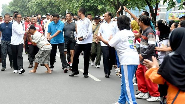 Kegiatan CFD di Solo berpusat di Jalan Slamat Riyadi, Minggu (24/1/2016). Kehadiran orang nomor satu di Indonesia ini pun langsung disambut heboh para warga.