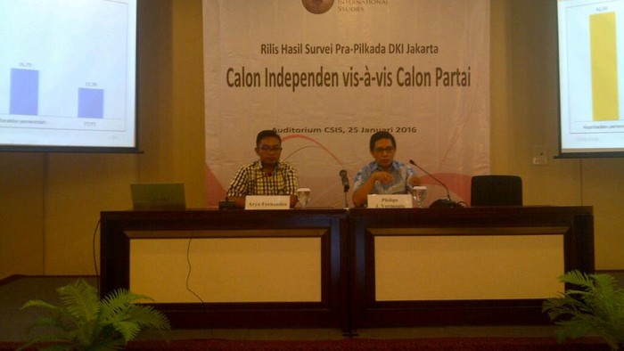 "Sebanyak 67,00 persen publik merasa puas, sebanyak 29 persen yang tidak puas dengan kinerja Gubernur DKI Jakarta," kata peneliti CSIS Arya Fernandes dalam rilis hasil surve Pra-Pilkada DKI 'Calon Independen vis-a-vis Calon Partai' di kantor CSIS, Graha Pakarti Centre, Jl Tanah Abang III, Jakarta Pusat, Senin (25/1/2016).