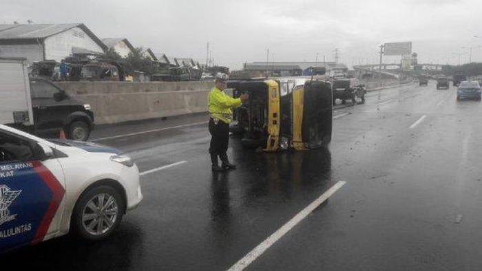 "Truknya dari arah bandara. (Terguling) karena licin jalanannya habis hujan. Kemungkinan selip," ujar Petugas Senkom Tol Cipta Marga Nusaphala Persada, Surahman kepada detikcom, Senin (25/1).