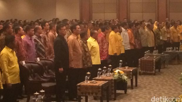 JK ikut membaca Ikrar Golkar yang dilafalkan semua kader Golkar. Begitu juga Menko Polhukam Luhut Binsar Pandjaitan.