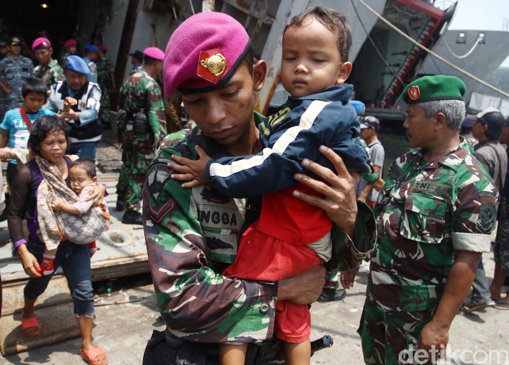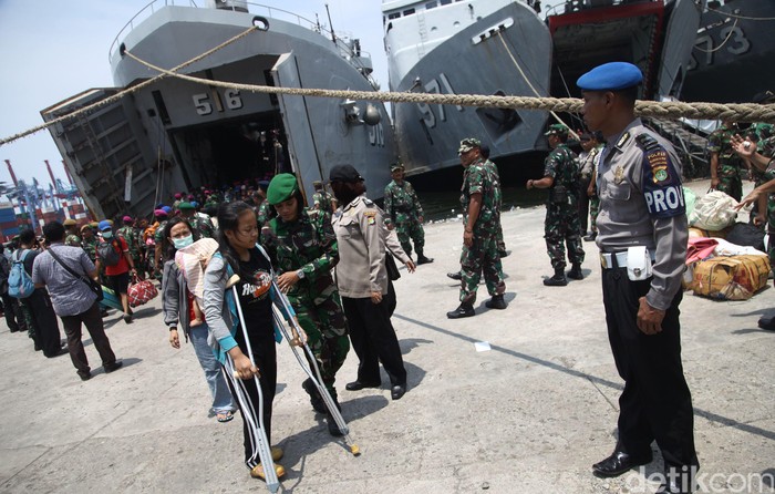 Para anggota Gafatar -- organisasi yang membubarkan diri pada 2015 -- kemudian menuju 13 bus Damri yang disediakan Kemensos di Dermaga Mako Kolinlamil Tanjung Priok, Jakarta Utara, Rabu (27/1/2016). Setelah bus penuh mereka dibawa ke Rumah Aman Buperta Cibubur, Jakarta Timur. Selain bus, disediakan 1 truk kontainer untuk membawa koper dan barang-barang mereka. Β