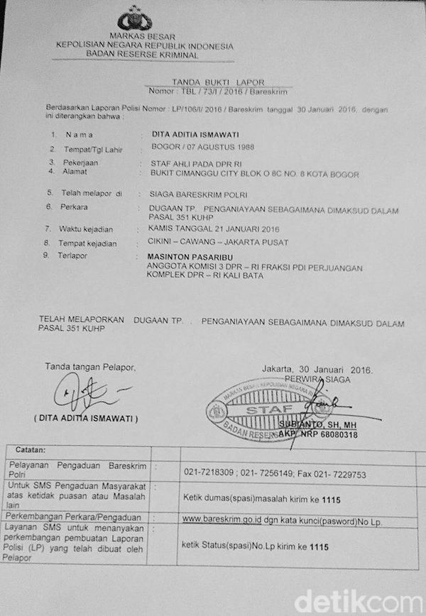 Seperti diketahui, Masinton dilaporkan dengan tuduhan melakukan penganiayaan terhadap staf ahlinya yang bernama Dita. Ia dilaporkan dengan Pasal 351 tentang penganiayan.