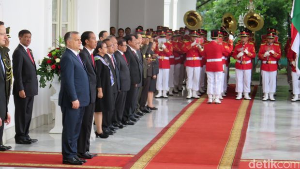 Jokowi dan Viktor kemudian menuju tempat yang telah disediakan yang berada tepat di depan teras Istana Merdeka. Pasukan marching band Paspampres melantunkan lagu kebangsaan Hungaria yang kemudian disusul lagu Indonesia Raya dan diiringi dentuman meriam sebanyak 21 kali.