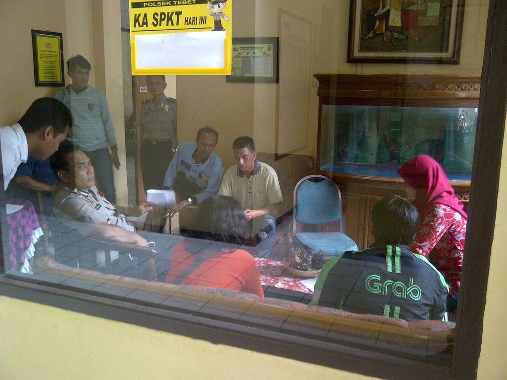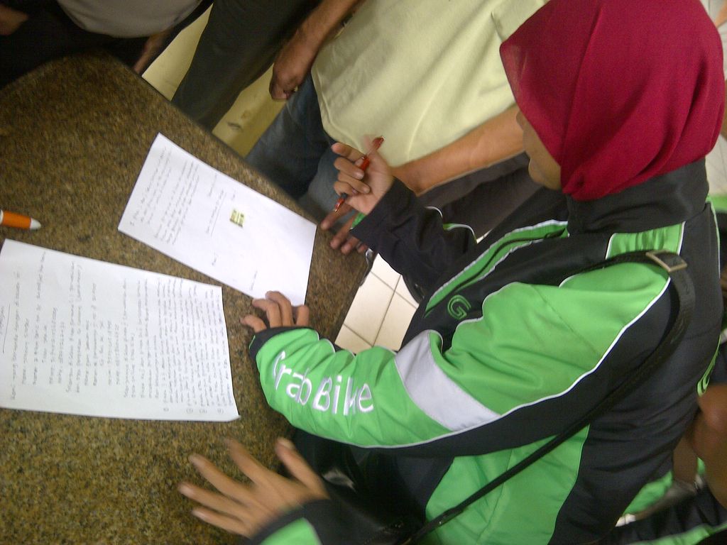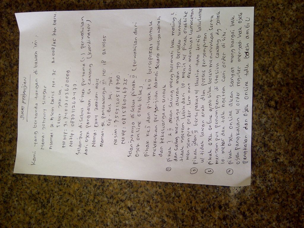 Perdamaian berlangsung di ruang SPK Polsek Tebet, Jl Supomo, Jakarta Selatan, Kamis (4/2/2016). Perdamaian dituangkan dalam sebuah kertas putih. Pihak yang berseteru yakni Juariyah (42) dan Johnny Siregar (50). Namun perjanjian perdamaian ditandatangani oleh perwakilan Lady GrabBike Ekky Zakiah Azis dan dari opang diwakili Johnny Siregar sendiri.