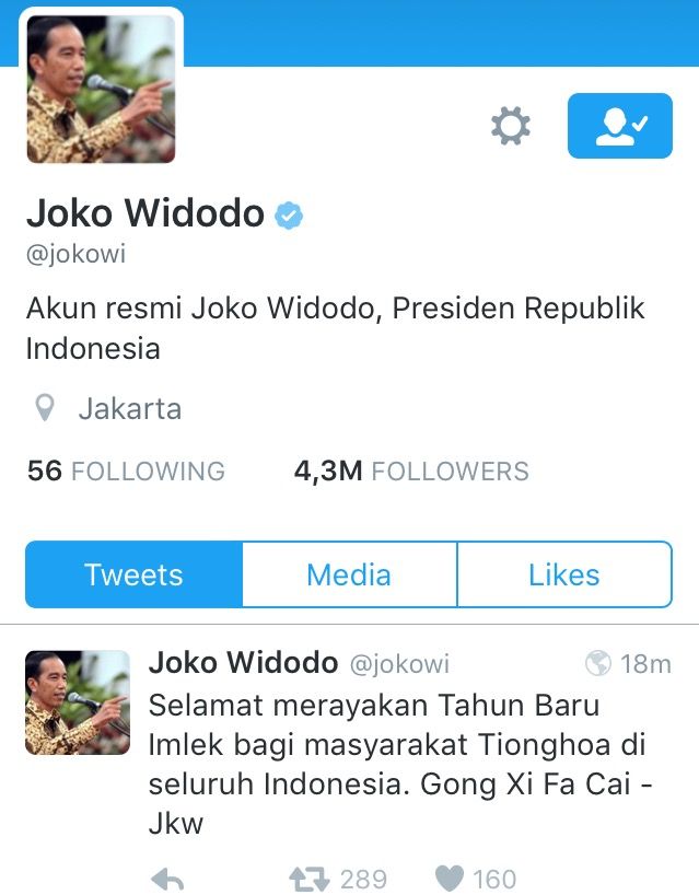 "Selamat merayakan Tahun Baru Imlek bagi masyarakat Tionghoa di seluruh Indonesia. Gong Xi Fa Cai. -Jkw," kicaunya di akun Twitter @jokowi sekitar pukul 08.00 WIB, Senin (8/2/2016).