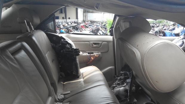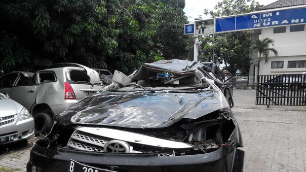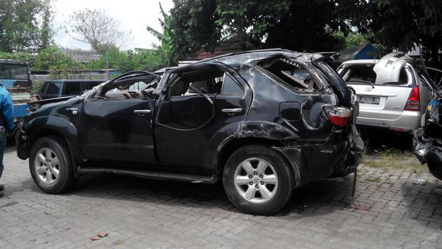 Saat ini mobil tersebut berada di Kantor Samsat Jakarta Barat, Jalan Daan Mogot, Senin (8/2/2016). Mobil itu terlihat rusak parah di seluruh bagiannya. Atap mobil itu terlihat penyok seperti habis berbenturan dengan benda berat.