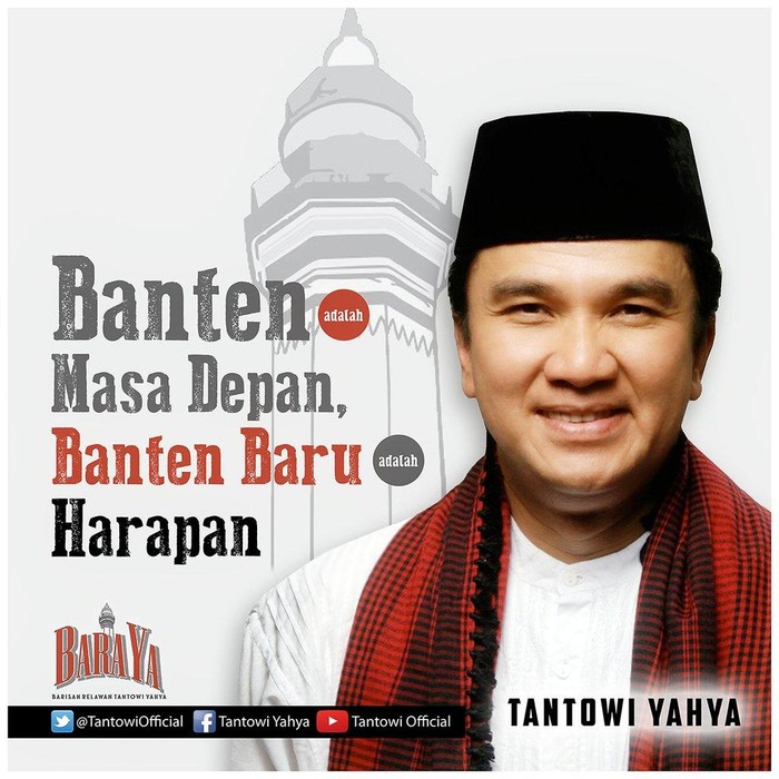 Salah satu meme yang beredar memuat foto Tantowi mengenakan baju koko warna putih, selendang merah, dan kopyah hitam tersenyum. Di samping kiri fotonya terdapat tulisan "Banten adalah Masa Depan, Banten Baru adalah Harapan". Di bawah tulisan itu ada kata Baraya, yang merupakan singkatan dari Barisan Relawan Tantowi Yahya.