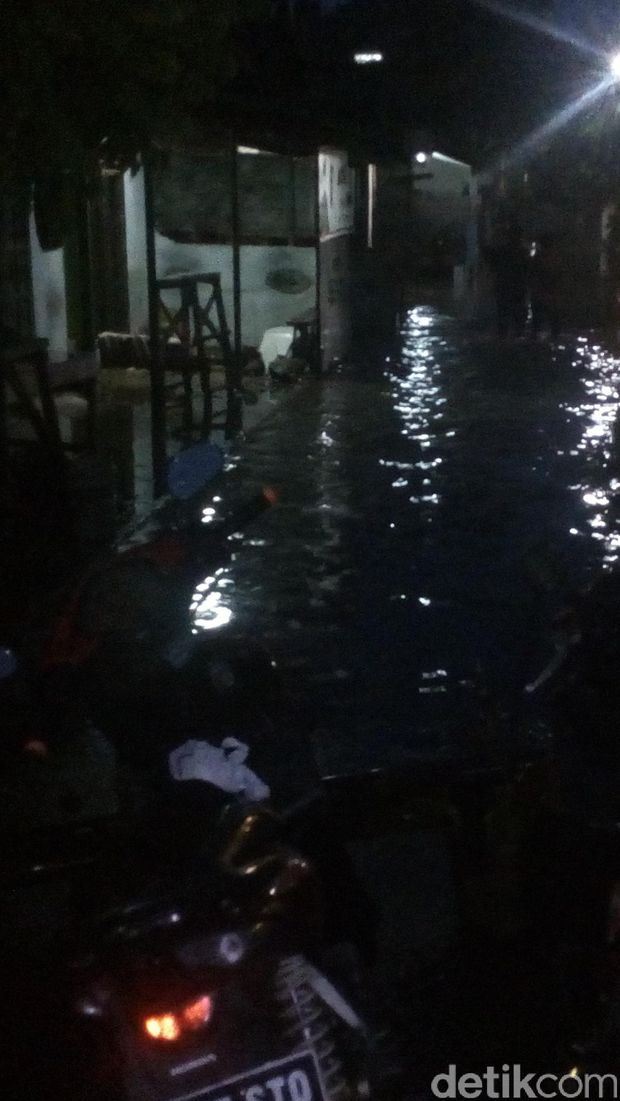 Pantauan dari lokasi saat ini, genangan air mencapai setinggi lutut orang dewasa. Atau sekitar 30-40 cm. Banyak warga yang tidak bisa membawa masuk motornya ke dalam rumah.