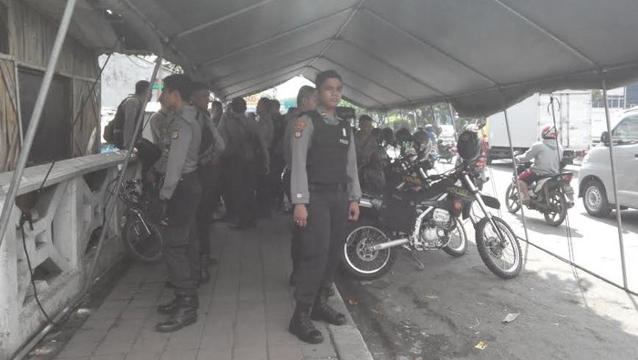 Sekitar pukul 09.47 WIB, Kamis (18/2/2016) puluhan petugas kepolisian mulai terlihat bersiaga di Jalan Raya Tubagus Angke, Jakarta Barat. Petugas mengendarai sepeda motor trail dan membawa senjata gas air mata.